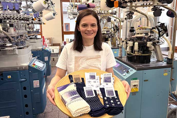 Jemný modrotisk s kytičkami, ovečky, zasněžené chaloupky, modré trnky… Takové a další půvabné valašské motivy zdobí ponožky, které vznikají v malé dílně rodinné firmy Knebl Hosiery v obci Hovězí kousek od Vsetína.