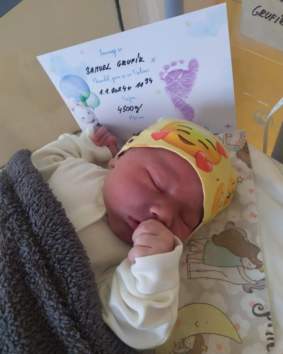 Prvním letošním miminkem narozeným ve Vsetínské nemocnici je chlapec Samuel Grufík. Narodil se 1.1.2024, krátce před polednem (v 11:34 hodin). Rodiče Veronika a Jan přijeli z nedaleké obce Hovězí. Maminka Veronika ve vsetínské porodnici rodila podruhé, péči všech, kteří se o ni starali, si velmi pochvalovala.