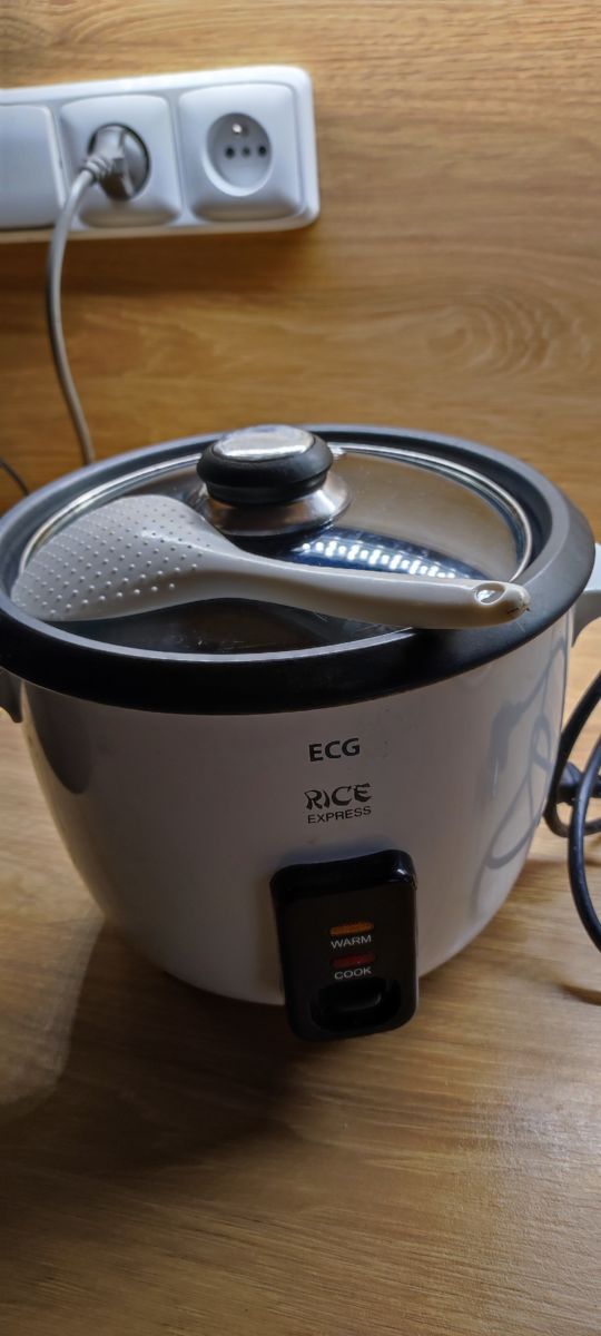 Rýžovar značky ecg objem 1litr velký není to malý půl litrovy až na 5 šálků rýže včetně plastové vařečky plastové odměrky a navíc odměrka na sůl poklice není originál ECG