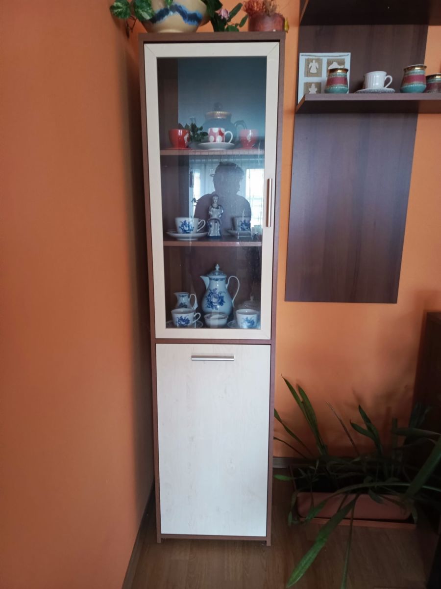 Prodám obývací stěnu ,která se skládá z vyšší samostatné skříňky, nižší komody, TV stolku a police na stěnu. Rozměry viz foto Cena komplet 1500 Kč