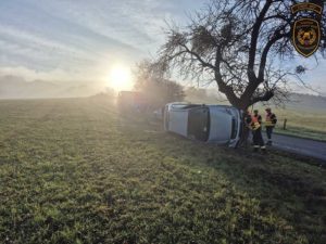 „Po příjezdu na místo velitel zásahu potvrdil nehodu jednoho auta, které sjelo ze silnice a skončilo na boku na okraji pole,“ uvedla tisková mluvčí hasičů Lucie Javoříková. Podle jejích slov řidička z havárie vyvázla bez zranění.