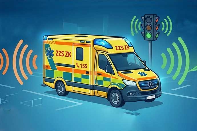 Jak systém funguje v praxi? Jakmile sanitka vyjede k zásahu, jednotka OBU začne vysílat signál o své poloze, směru a prioritě. Tento signál přijímá řídicí systém semaforů (takzvaná infrastruktura C2X). Ten „ví“, že se blíží vozidlo IZS. Řadič křižovatky proto upraví signalizaci tak, aby sanitka dostala zelenou vlnu – tedy bezpečný a plynulý průjezd bez zastavení. Jakmile sanitka projede, křižovatka se vrátí do běžného režimu řízení dopravy.
