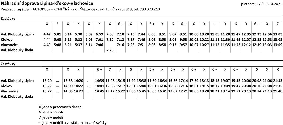 Město Valašské Klobouky upozorňuje obyvatele, že v souvislosti s probíhající rekonstrukcí komunikace mezi Valašskými Klobouky a Vlachovicemi dojde od pátku 17. září do pátku 1. října (včetně) k úplné uzavírce úseku mezi Valašskými Klobouky a Lipinou. Doprava osobními automobily bude umožněna průjezdem přes Křekov a Vlachovice. Objízdná trasa dále povede na Vlachovu Lhotu.