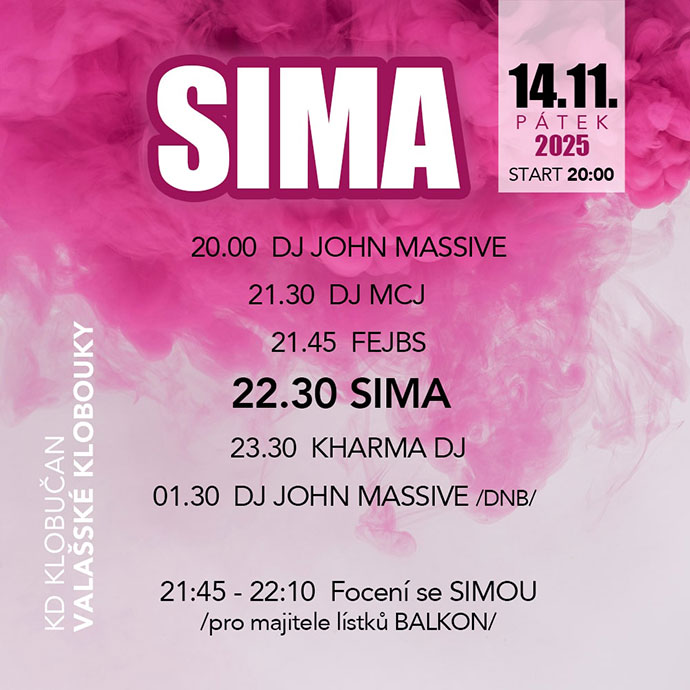 Slovenská zpěvačka SIMA, jedna z nejvýraznějších osobností současné pop a rapové scény, míří do Valašských Klobouk! Držitelka milionových zhlédnutí na YouTube a autorka hitů jako Story, Nie som tvoja či Masterpiece přiveze do kulturního domu Klobučan svou energickou show, která propojuje moderní zvuk, osobitý styl a silné texty. Publikum čeká večer plný hudby, světel a emocí.