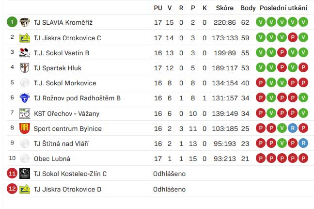 Krajský přebor kuželkářů pokračoval o víkendu dalším kolem. Hráči KK CAMO Slavičín dokázali uspět v těžkém duelu v Machové a v celkové tabulce se již vyšvihli na páté místo. V dalším kole mají Slavičané volný los. Kuželkáři Bylnice měli v tomto kole svoje utkání s Kroměříží odloženo. Výsledky Krajského přeboru: TJ KELČ - TJ SOKOL MACHOVÁ B 8:0 2678:2483 10.0:2.0 23.2. TJ BOJKOVICE KRONS - VKK VSETÍN B 8:0 2732:2574 11.5:0.5 23.2. TJ JISKRA OTROKOVICE B - TJ VALAŠSKÉ MEZIŘÍČÍ C 2:6 2463:2544 3.0:9.0 23.2. TJ SOKOL MACHOVÁ A - KK CAMO SLAVIČÍN 3:5 2455:2568 3.0:9.0 24.2. SC BYLNICE - KK KROMĚŘÍŽ B ODLOŽENO 29.3. KC ZLÍN C - VOLNO Tabulka družstev: 1. TJ Valašské Meziříčí C 15 12 2 1 88.0 : 32.0 117.0 : 63.0 2621 26 2. TJ Bojkovice Krons 15 12 0 3 86.5 : 33.5 115.0 : 65.0 2626 24 3. KC Zlín C 14 9 1 4 69.5 : 42.5 89.0 : 79.0 2626 19 4. TJ Kelč 14 8 2 4 68.0 : 44.0 97.5 : 70.5 2627 18 5. KK Camo Slavičín 15 9 0 6 66.0 : 54.0 101.0 : 79.0 2627 18 6. TJ Sokol Machová A 14 8 1 5 65.5 : 46.5 96.0 : 72.0 2631 17 7. SC Bylnice 14 5 0 9 44.5 : 67.5 71.0 : 97.0 2533 10 8. VKK Vsetín B 15 4 1 10 40.5 : 79.5 74.5 : 105.5 2495 9 9. KK Kroměříž B 13 3 0 10 32.0 : 72.0 59.5 : 96.5 2495 6 10. TJ Sokol Machová B 15 3 0 12 36.5 : 83.5 69.0 : 111.0 2522 6 11. TJ Jiskra Otrokovice B 14 2 1 11 35.0 : 77.0 58.5 : 109.5 2483 5 Program dalšího kola - 17. kolo: 1.3.2024 pá 17:00 TJ Bojkovice Krons - TJ Valašské Meziříčí C 1.3.2024 pá 17:00 TJ Kelč - KK Kroměříž B 1.3.2024 pá 18:00 KC Zlín C - VKK Vsetín B 2.3.2024 so 14:00 TJ Sokol Machová A - TJ Sokol Machová B 2.3.2024 so 17:30 SC Bylnice - TJ Jiskra Otrokovice B KK Camo Slavičín - volný los