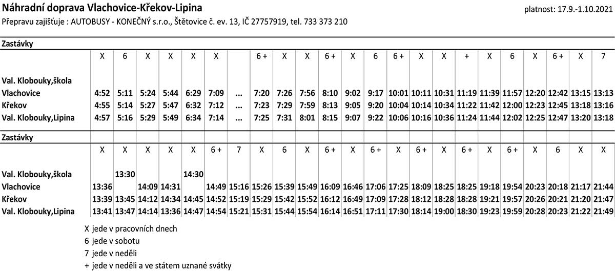 Město Valašské Klobouky upozorňuje obyvatele, že v souvislosti s probíhající rekonstrukcí komunikace mezi Valašskými Klobouky a Vlachovicemi dojde od pátku 17. září do pátku 1. října (včetně) k úplné uzavírce úseku mezi Valašskými Klobouky a Lipinou. Doprava osobními automobily bude umožněna průjezdem přes Křekov a Vlachovice. Objízdná trasa dále povede na Vlachovu Lhotu. Doposud se z Valašských Klobouk do Lipiny autem dostat dalo, nebyl jen umožněn průjezd dál na Vlachovice (více ZDE). Pro obyvatele uzavřených obcí bude zřízen speciální spoj minibusem, který je bude svážet do Vlachovic k přípoji dle náhradního jízdního řádu. Pro žáky základních škol budou vyčleněny mimořádné spoje, které je převezou bez přestupu až ke školám do Vlachovic a Valašských Klobouk.