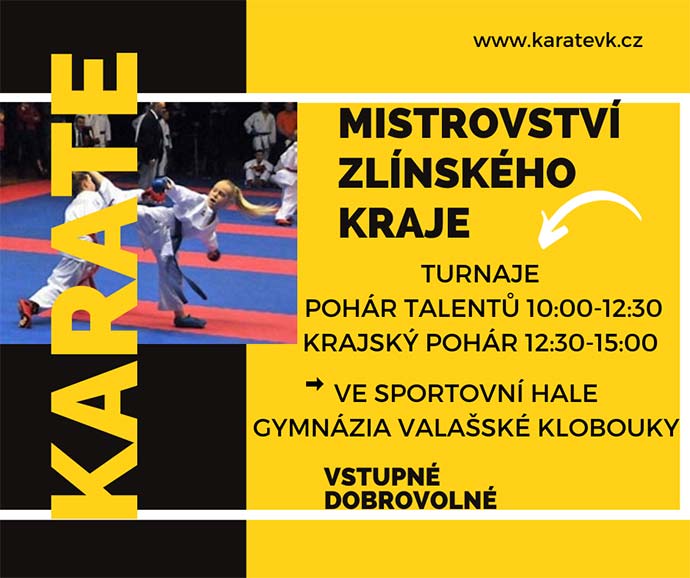 Valašské Klobouky budou poprvé v historii hostit Mistrovství Zlínského kraje v soutěžích o Krajský pohár karate a Pohár talentů Zlínského kraje. Vše proběhne v sobotu 7. 10. ve sportovní hale Gymnázia Valašské Klobouky.