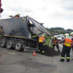 Nákladní automobil zabezpečoval před převrácením traktor. Toto zabezpečení ale nebylo dostačující a nákladní automobil se posunoval směrem do příkopu. „Velitel zásahu si vyžádal na místo vyprošťovací automobil hasičů z požární stanice Otrokovice. Ten přijel na místo v 12:02 hodin. Vyproštění ale nebylo možné, protože nákladní automobil měl lehkou hliníkovou konstrukci. Hasiči museli proto asfaltovou směs z korby nákladního automobilu odstranit ručně. Hasičům v tom později pomáhal i bagr,“ popsal Roman Žemlička.