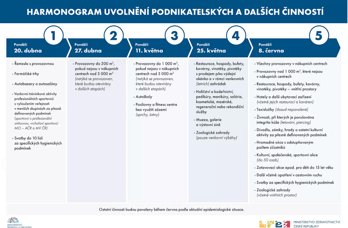 Pět etap má harmonogram postupného uvolňování podnikatelských a dalších činností. V úterý 14. dubna ho projednala vláda. Scénář mimo jiné počítá s tím, že od pondělí 20. dubna budou moct opět začít fungovat řemeslníci, autobazary a autosalóny, farmářské trhy či tréninky profesionálních sportovců na venkovních sportovištích za přesně definovaných podmínek. Rovněž se budou moct konat malé svatby či individuální konzultace a zkoušky pro studenty nejvyšších ročníků na vysokých školách. K dalšímu zmírnění by mělo – vždy samozřejmě v závislosti na vývoji situace v kontextu s pandemií koronaviru – docházet postupně v potřebném v časovém rozestupu.
