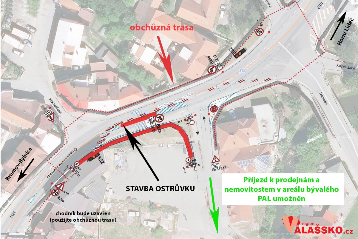 Od čtvrtka 1. srpna do pátku 30. srpna (pozn. ve čtvrtek to bylo ještě bez semaforů) bude doprava na komunikaci svedena do jednoho jízdního pruhu a bude řízena kyvadlově pomocí semaforů. Pro pěší je stanovena obchůzná trasa, protože přes staveniště nebude možné projít. Příjezd k prodejnám a nemovitostem v areálu bývalého PAL bude umožněn.