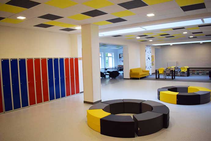 Průběžně zároveň probíhala rekonstrukce školních šaten. Opraveny byly stropy, elektrorozvody i podlahy a prostor získal nové, moderní sedací prvky. Díky tomu jsou šatny přehlednější, svěžejší a příjemnější pro každodenní využívání žáky.
