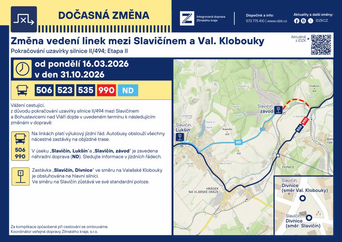 Změna se týká také zastávky „Slavičín, Divnice“. Ve směru na Valašské Klobouky bude po dobu uzavírky přesunuta na hlavní silnici, zatímco ve směru zpět do Slavičína zůstává ve své standardní poloze.