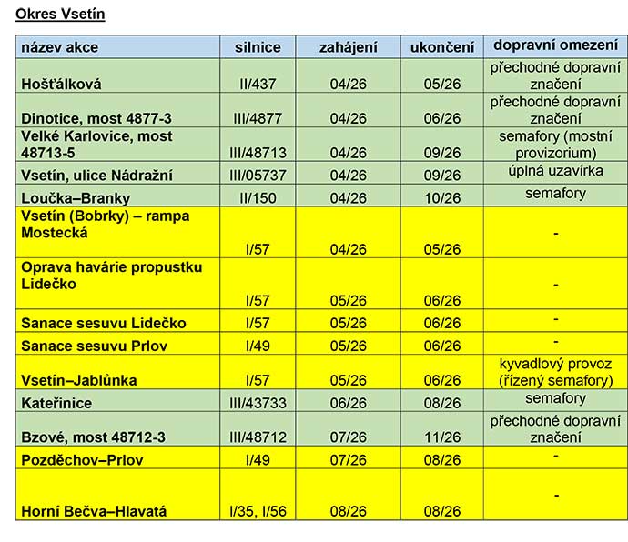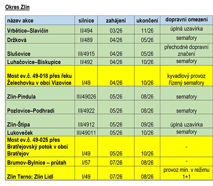 Pozn.: Zeleně jsou vyznačeny plánované akce Ředitelství silnic Zlínského kraje (ŘSZK), žlutě pak plánované akce Ředitelství silnic a dálnic ČR (ŘSD ČR). Finální termíny a související dopravní omezení bude ŘSD ČR průběžně upřesňovat po dokončení výběrových řízení na zhotovitele daných akcí a podpisu smluv.