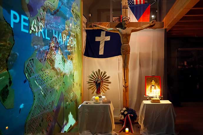 Modlit se bude u repliky kříže, jehož originál nechal zhotovit Gerald Fink, stíhací pilot židovského původu, který byl transportován do zajateckého tábora až po smrti otce Emila a nikdy se s ním nepotkal. Přesto tvář Krista nese Kapaunovu podobu.