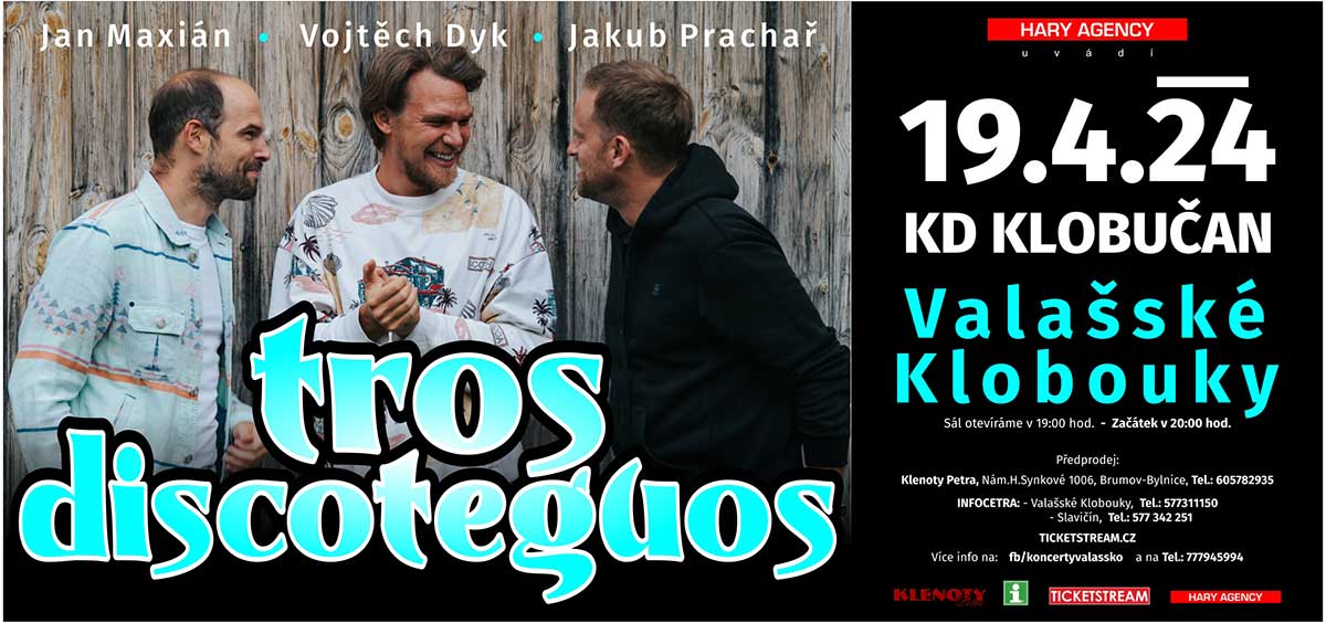 Vojtěch Dyk, Jakub Prachař, Jan Maxián vystoupí ve Valašských Kloboukách již v pátek 19. 4. 2024. Tyhle kluky netřeba představovat. Kapela TROS DISCOTEQUOS je složená z téměř všech členů dnes již nevystupující kapely NIGHTWORK.