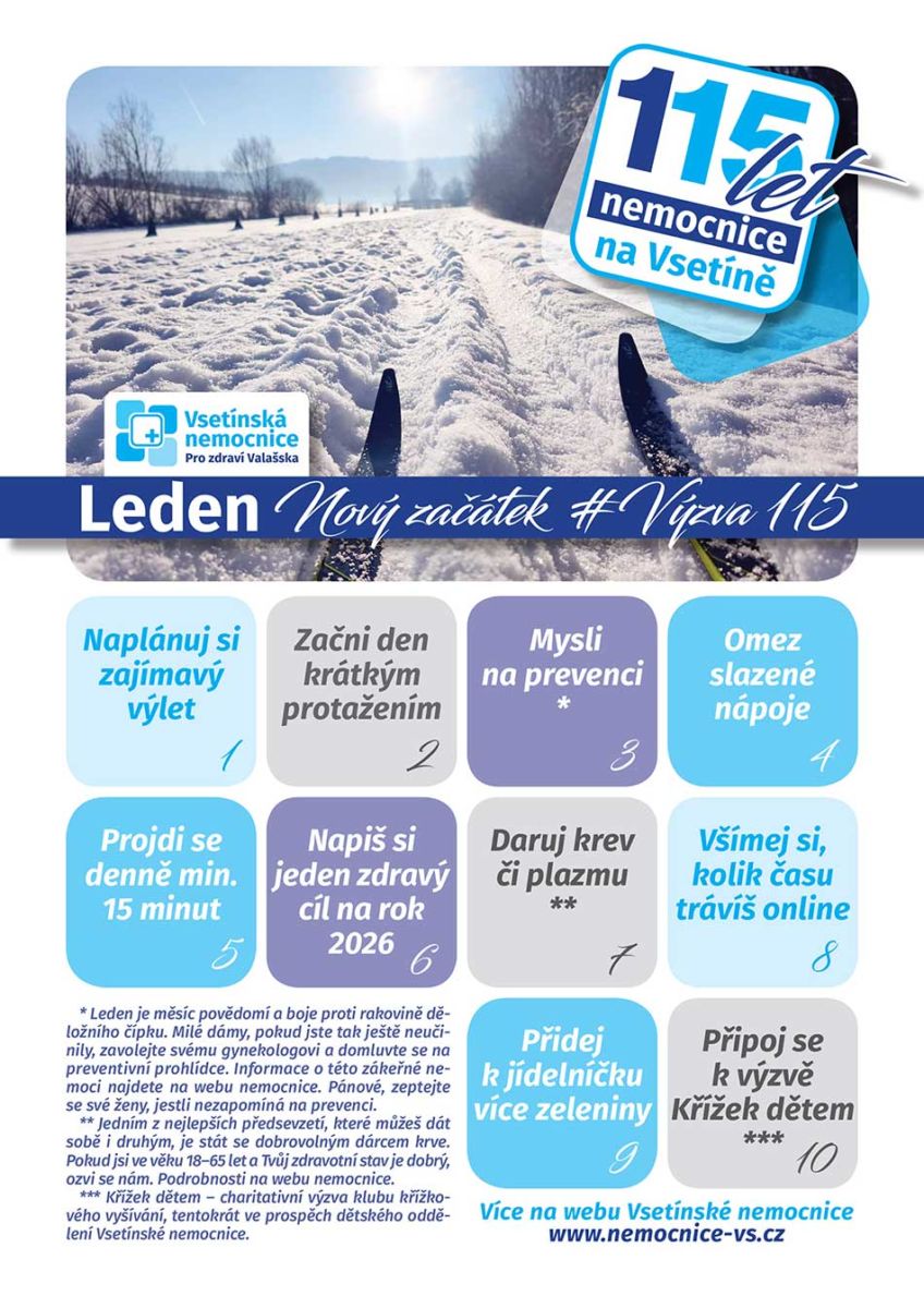 Lednová část výzvy vybízí nejen k definování jednoho zdravého cíle na rok 2026, ale také k zamyšlení nad dárcovstvím krve, omezením slazených nápojů, obohacením jídelníčku o zeleninu nebo třeba k naplánování společného výletu.