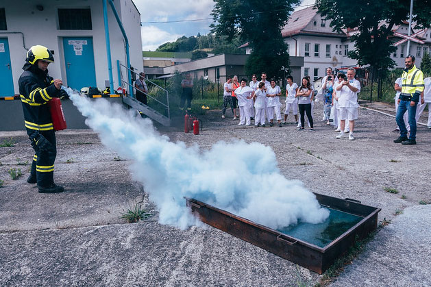 Vsetínská nemocnice procvičuje možné krizové scénáře pravidelně. V loňském roce probíhal opět ve spolupráci s hasiči nácvik evakuace budovy oddělení následné péče. Pacienty při něm nahradili figuranti a zapojena byla i výšková plošina. „Letos jsme chtěli udělat změnu, proto jsme připravili nádobu, v níž jsme míchali hořlavou směs. Tu jsme vždy zapálili a zaměstnanci si sami zkusili, jak takové hašení probíhá. Je to důležité zejména pro požární hlídky na našich zdravotnických provozech s lůžkovými stanicemi, kde jsou hospitalizovaní pacienti a je tam i daleko větší riziko ohrožení osob při vypuknutí skutečného požáru. Na zdravotnících bylo vidět, že praktický nácvik přivítali a svým způsobem si jej i užívali, protože naštěstí nešlo o reálnou situaci,“ doplnil Jan Skácal, bezpečnostní technik Vsetínské nemocnice.